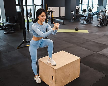 Uitvoering: Plaats één voet stevig op het verhoogde oppervlak. Duw jezelf omhoog totdat je volledig rechtop staat en je achterste voet niet meer de grond raakt. Span je bilspieren bovenaan aan. Laat jezelf gecontroleerd zakken naar de startpositie. Herhaal met hetzelfde been of wissel af per herhaling.