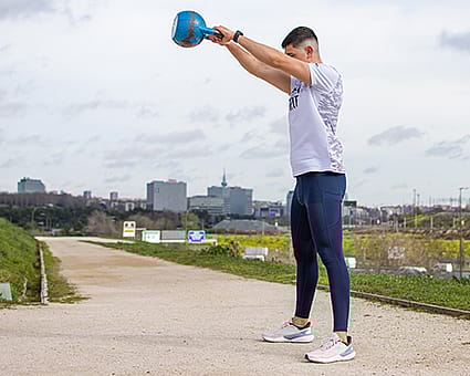 Uitvoering: Sta met je voeten op schouderbreedte en houd een kettlebell met beide handen vast. Buig licht door je knieën en duw je heupen naar achteren terwijl je de kettlebell tussen je benen zwaait. Duw explosief je heupen naar voren om de kettlebell omhoog te zwaaien tot schouderhoogte. Laat de kettlebell gecontroleerd terugzwaaien tussen je benen en herhaal. Zorg ervoor dat de kracht uit je heupen komt, niet uit je armen.