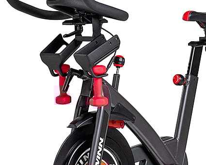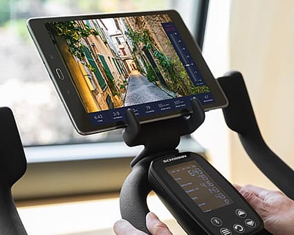 Voor wie graag wilt fietsen en daarvoor fitnessapps gebruikt (later meer over de fitnessapps) of graag een film kijkt is er ook nog een speciale device houder aanwezig op het stuur. Hier kan je jouw tablet of smartphone op plaatsen. Is je tablet of smartphone bijna leeg? Geen zorgen ook hier heeft Schwinn aan gedacht, zo is er een USB poort aanwezig waar je jouw device op kan aansluiten.