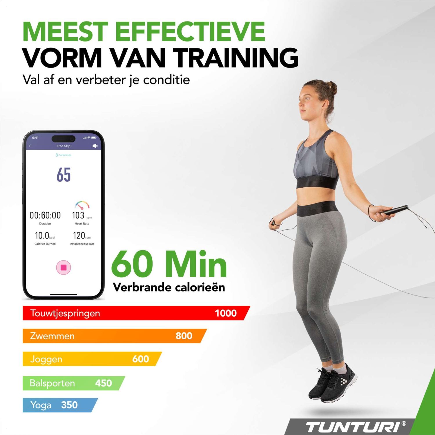 Met de Tunturi Smart Jump Rope, met Bluetooth, 4 modi en gratis app, haal je het maximale uit elke sprong.
