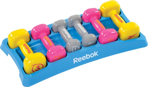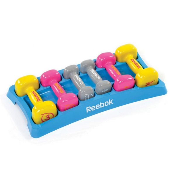 De set bestaat uit 6 dumbbells van 2 x 1 Kg, 2 x 2 Kg, en 2 x 3 Kg in een bijpassend design opbergrek van Reebok.