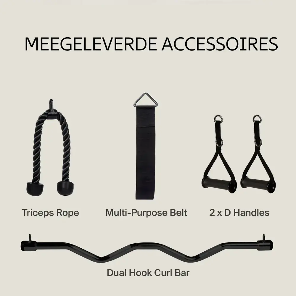 Het apparaat wordt geleverd met 5 accessoires, waaronder 2x D handles, een dual hook curl bar, een chin/dip belt en een triceps rope, om gevarieerde workouts te kunnen doen.