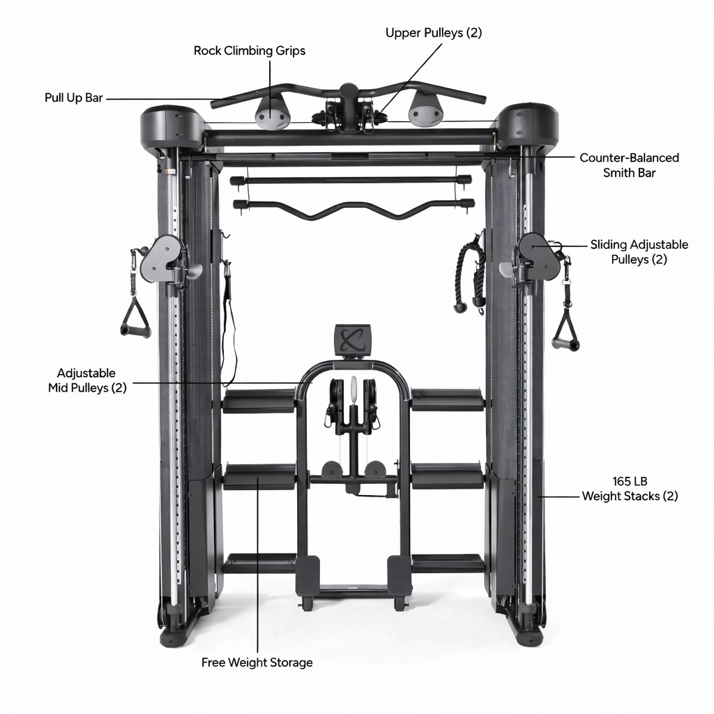 De gepatenteerde Smith-bar is volledig geïntegreerd met de gewichtenstapel en beschikt over een uitgebalanceerd systeem voor moeiteloze overgangen tussen oefeningen. Met twee gewichtstapels van elk 75 kg en een uniek gewichtsvermenigvuldigersysteem, kan de weerstand op de Smith-bar worden verdubbeld tot 160 kg voor intensievere trainingen. De machine beschikt ook over 6 opbergrekken voor dumbbells, kettlebells en meer, allemaal in een compact ontwerp.