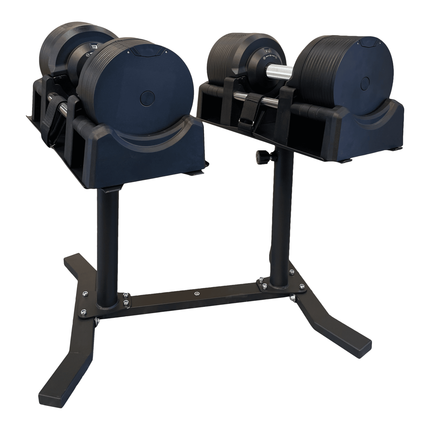 Met het handige verstelsysteem kunt u het gewicht van de dumbbell eenvoudig aanpassen in stappen van 1,5 kg. Het minimale gewicht van deze dumbbells is 4 kg. De dumbbells worden per stuk geleverd met een bijpassende houder, en een opbergrek is los verkrijgbaar.